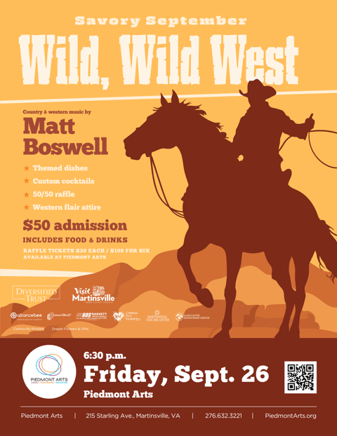Saddle up for some rootin’, tootin’ fun at Savory September: Wild, Wild West from 6:30-9:30 p.m., Friday, Sept. 26, at Piedmont Arts.