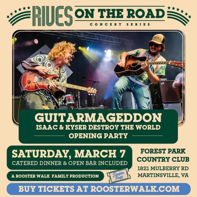 Rives on the Road 2026 Season Opening Party ft. the special allstar collaboration Guitarmageddon: Isaac & Kyser Destroy the World!   When: Saturday, March 7 2026  Where: Forest Park Country Club, Martinsville, VA    Season Passes On Sale Now! Rives on the Road Season Pass: $150 Includes: • Admission to the opening party featuring The Rooster […]