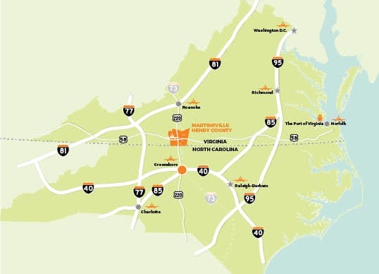 Centrally located on the East Coast, Martinsville – Henry County is positioned on the southern border of Virginia, and covers 385 square miles. This thriving community is conveniently positioned within a day’s drive to 60% of the U.S. population, and is strategically located within 50 miles of the major metropolitan areas of Roanoke, Virginia and Greensboro, North Carolina.